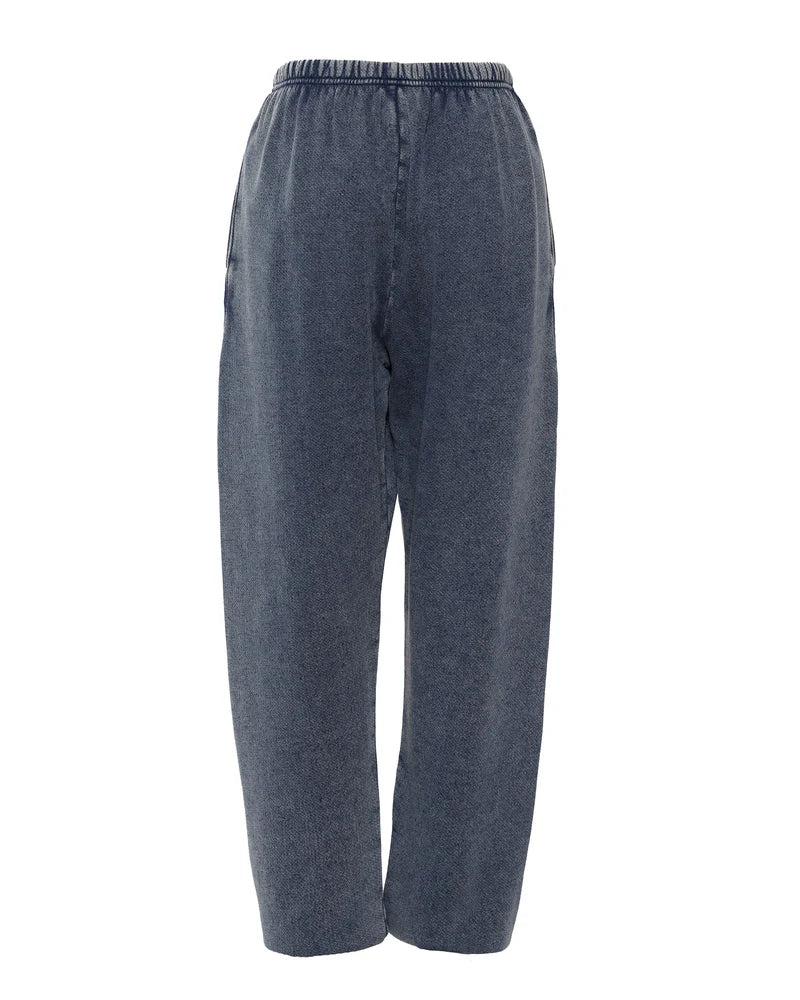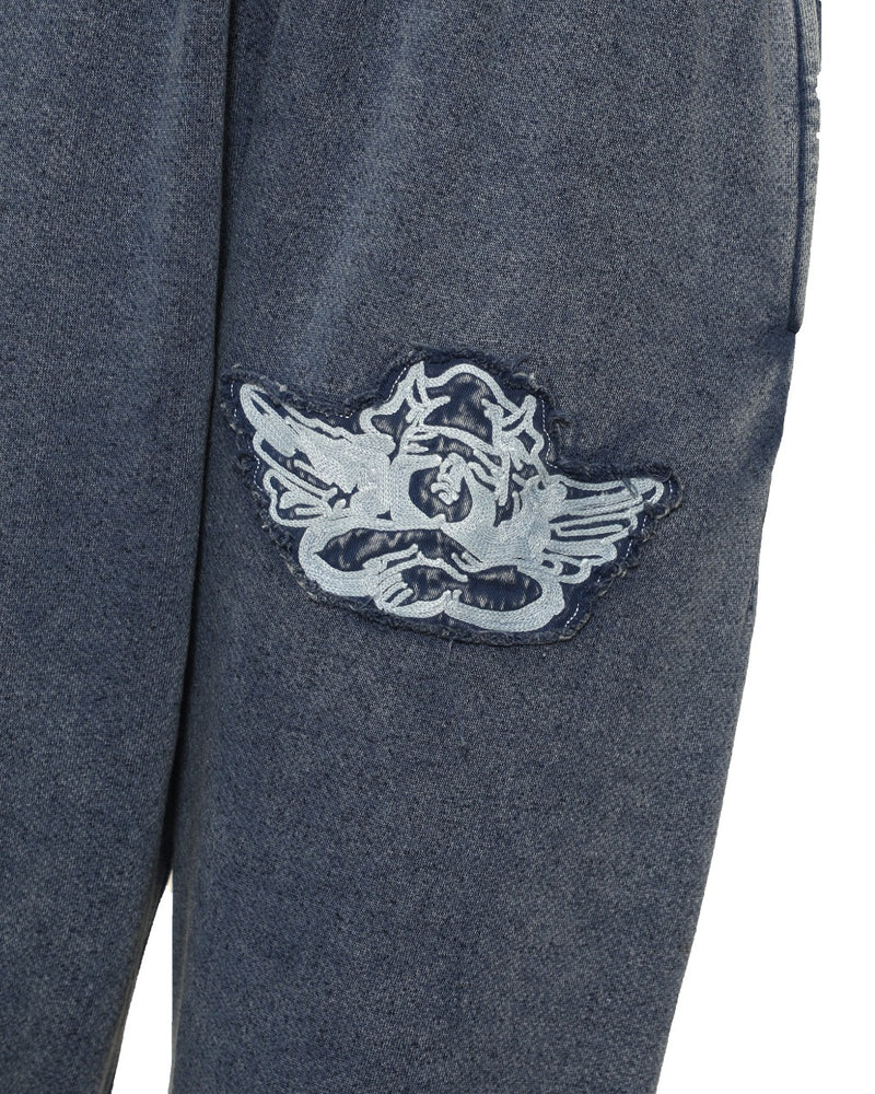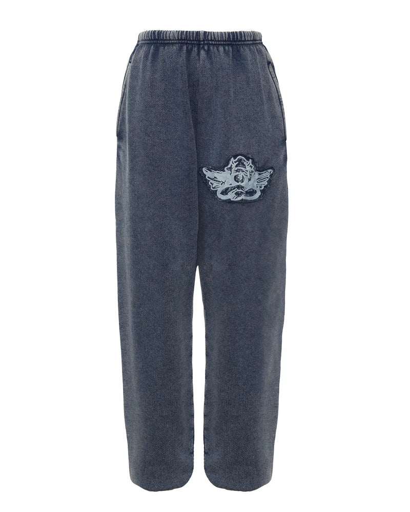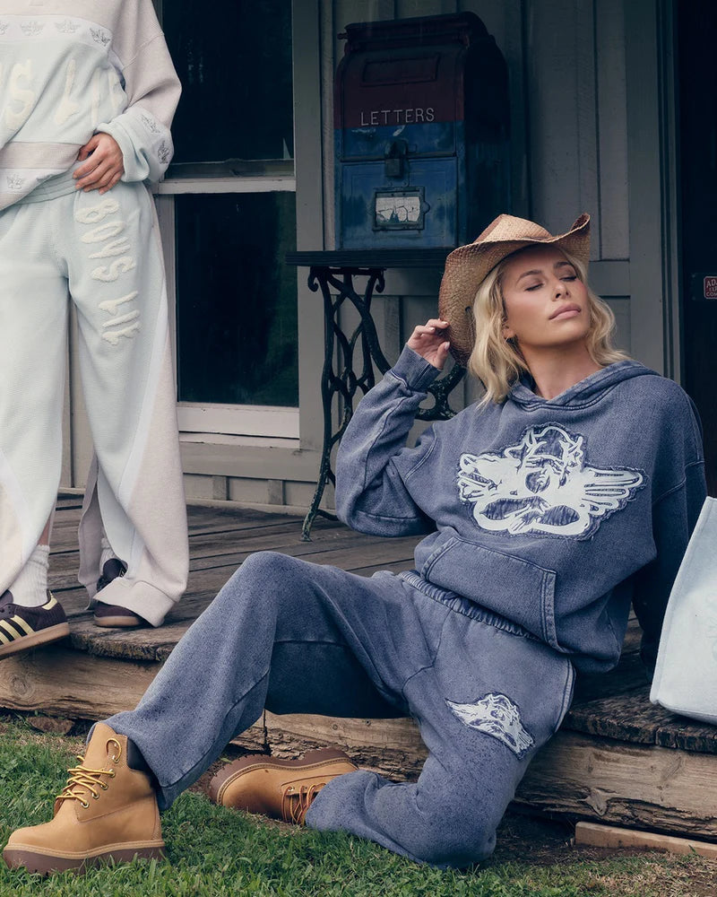A customer favorite returns with a fresh twist in the new Blue Stitch Me Up Kimmy Pant, featuring a monochromatic, denim-washed look. The top showcases a blue embroidered cherub on the front, framed by a distressed fabric patch for a perfectly worn-in vibe. Cozy, edgy, and effortlessly cool.