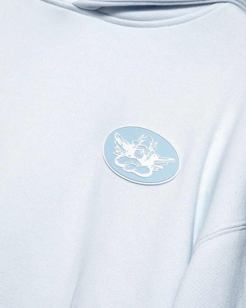 This light blue hoodie offers an easy, relaxed fit with soft fleece for all-day comfort. Featuring an angel logo patch on the front and a "Made in Heaven, But I'm No Angel" graphic on the back, it adds a clean, playful touch to a classic silhouette.